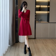 法式红色v领针织连衣裙女秋季收腰显瘦蓬蓬a字裙子高级感气质短裙