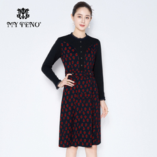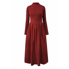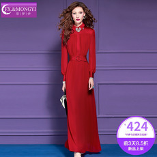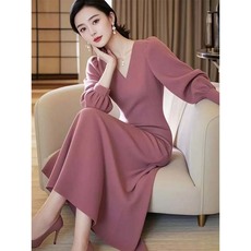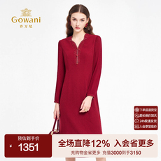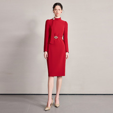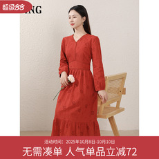 乔万尼红色连衣裙女长袖V领收腰中长款气质轻熟风秋冬裙子ED3E311