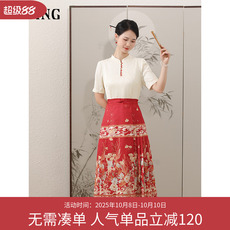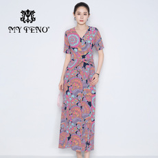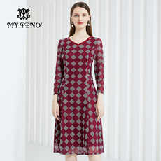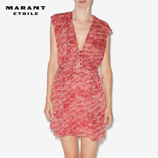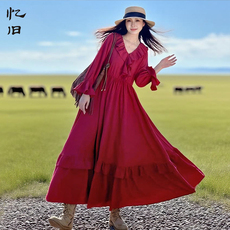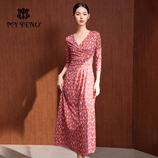 马天奴2025秋冬新款红色花边V领收腰印花连衣裙子气质度假时尚女