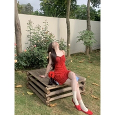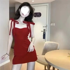 夏季新款荷叶气质辣妹红色吊带连衣裙小个子纯欲风收腰显瘦短裙女