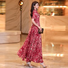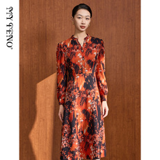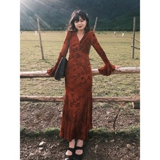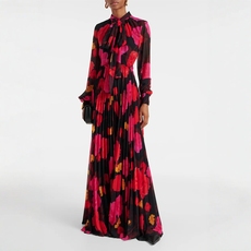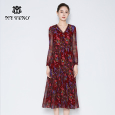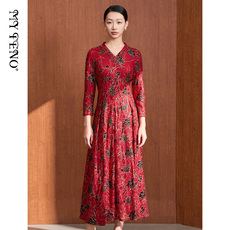 新款 2024春夏长袖复古红色印花收腰优雅百褶长裙雪纺连衣裙女