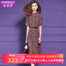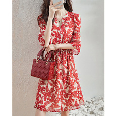 大码胖mm法式绝美气质红色连衣裙女装秋季爆款碎花度假风收腰长裙