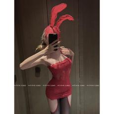 H家欧美女装 禁欲辣妹蕾丝镂空一字肩连衣裙收腰性感红色a字短裙