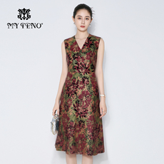 马天奴2025秋冬新款红色印花V领无袖收腰皮裙连衣裙子时尚气质女