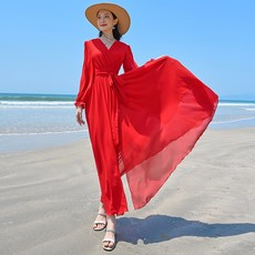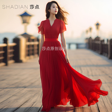 独特设计感连衣裙2024新款女红色雪纺收腰显瘦长裙沙滩裙海边度假