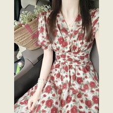 复古法式红色碎花V领连衣裙女夏季新款海边度假风气质收腰A字长裙