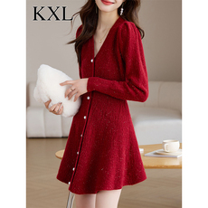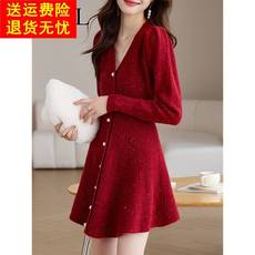 2024新款秋冬短裙小个子针织连衣裙女收腰亮丝新年战袍红色毛衣裙