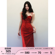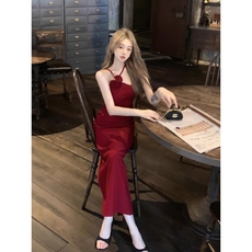 2024新款夏季红色吊带裙女法式气质收腰显瘦性感无袖包臀连衣裙子