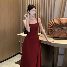 红色方领吊带连衣裙新款夏季收腰显瘦日常可穿敬酒服订婚红裙子