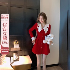 新年红色V领辣妹长袖连衣裙女秋冬季新款气质修身收腰A字裙短裙子