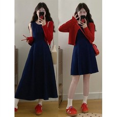 大码胖深蓝色牛仔背心收腰连衣裙红色长袖防晒开衫两件套女春季