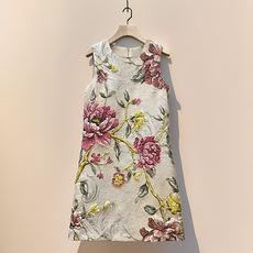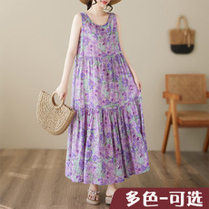 25夏季新款复古民族度假风V领钉珠宽松显瘦A字碎花无袖背心连衣裙
