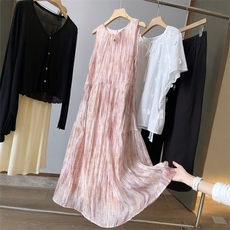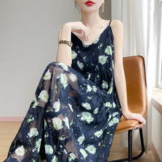 25夏季千云纱吊带连衣裙女V领印花长裙宽松气质过膝A字裙背心长裙