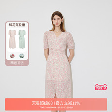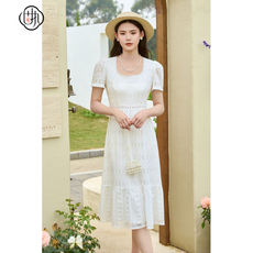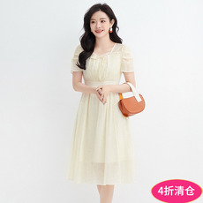 固执夏季新款法式气质方领短袖荷叶摆中长连衣裙10832LQ08064