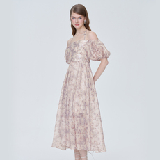 艾丽丝2025夏季新款连衣裙网纱拼接印花中长裙方领甜美短袖仙女裙