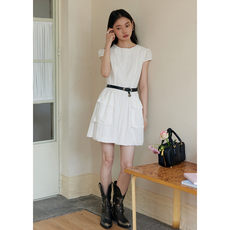 法式假两件短袖连衣裙女夏新款设计感韩版收腰a字裙显瘦中长裙子