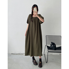 日单u~女装23夏款纯棉圆领褶皱拼接显瘦喇叭型中长裙短袖连衣裙