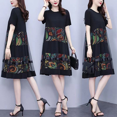 夏欧美风韩版印花拼接短袖连衣裙宽松休闲显瘦女装大码中长款裙子