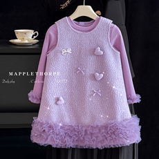儿童裙子2024春秋新款童装冬季加绒女童网纱裙宝宝爱心公主连衣裙