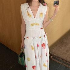 良良家度假风油画印花褶皱背心连衣裙女夏季新款复古无袖碎花长裙
