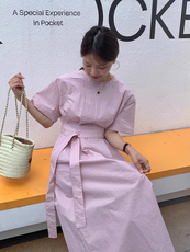 韩国chic夏季甜美减龄圆领绑带收腰显瘦后开叉中长款短袖连衣裙女