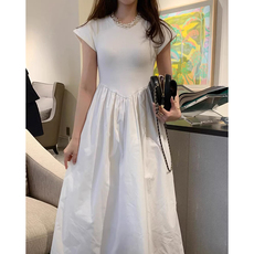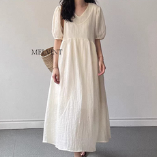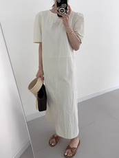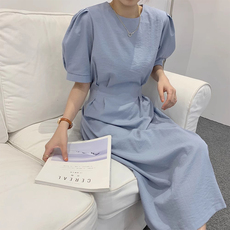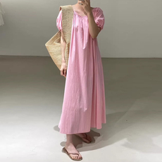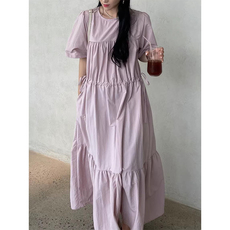 韩国chic夏季新款小众慵懒风圆领压褶设计宽松泡泡袖连衣裙长裙女