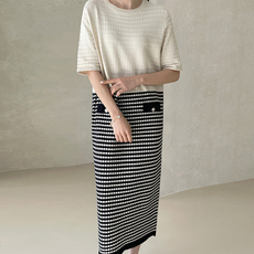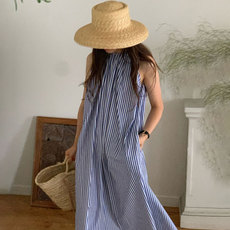 韩国chic夏季气质慵懒风圆领撞色条纹设计宽松休闲无袖背心连衣裙