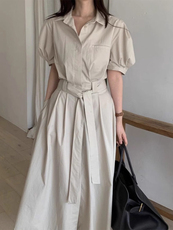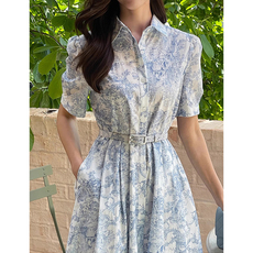 韩国东大门夏季小众气质翻领一片式绑带收腰显瘦短袖衬衫连衣裙女