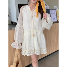 良良家抽绳系带大摆型连衣裙女夏季新款小众慵懒风泡泡袖白色长裙