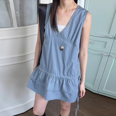 韩国 2025夏新款简洁v领抽绳荷叶边短款无袖连衣裙女
