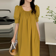 良良家褶皱设计感泡泡袖连衣裙女夏季新款减龄气质纯色宽松长裙子
