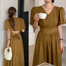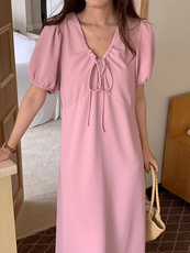 韩国chic夏季甜美温柔V领抽绳系带高腰显瘦中长款泡泡袖连衣裙女
