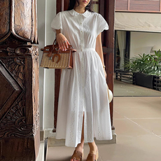 良良家高级感刺绣提花短袖连衣裙女夏季新款优雅气质衬衫式长裙子