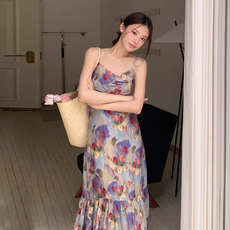 良良家油画印花抽褶吊带连衣裙女夏季新款复古度假风收腰鱼尾长裙