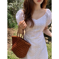 韩国chic夏季甜美减龄方领镂空刺绣提花系带收腰显瘦泡泡袖连衣裙