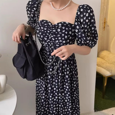 韩国chic夏季新款法式复古方领收腰显瘦中长款泡泡袖碎花连衣裙女