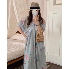 良良家度假风V领褶皱泡泡袖碎花连衣裙女夏季新款复古浪漫A字长裙