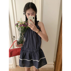 良良家甜美减龄格纹花边背心连衣裙女夏季新款设计感抽绳系带短裙