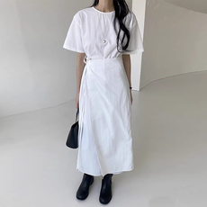 韩国chic夏季法式慵懒风圆领宽松休闲后开叉设计短袖连衣裙长裙女