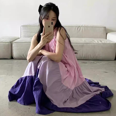 韩国chic夏季复古温柔风褶皱撞色拼接设计宽松蛋糕裙吊带连衣裙女