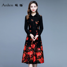 长袖连衣裙女2025秋季新款气质端庄修身显瘦中长款拼接印花a字裙