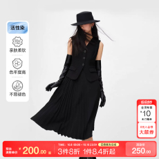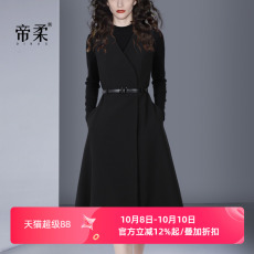 无有无印黑色V领帅气显瘦a字中长款长袖收腰裙子连衣裙22031