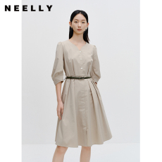 NEELLY纳俪商场同款秋季新款气质V领吊带连衣裙女中长款收腰A字裙