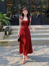 红色针织连衣裙夏季2025新款短袖收腰显瘦气质小香风A字裙中长款