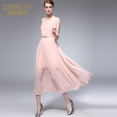 黛薇璐媤粉色雪纺连衣裙女夏装新款度假气质收腰褶皱大摆飘逸长裙
