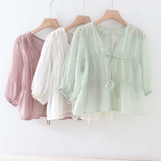 B06054日单夏新款客供料系带V领宽松女纯色甜美日系轻薄透视衬衫