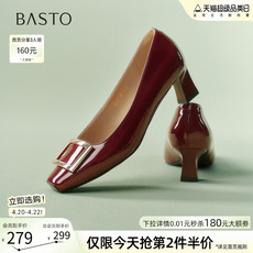 康莉单鞋女粗跟秋季新款方头真皮百搭气质方扣漆皮通勤黑色高跟鞋