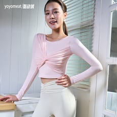 yoyomeat网纱纽结运动T恤带胸垫露脐美背长袖瑜珈服速干健身上衣