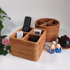越南手工藤编遥控器杂物收纳篮客厅茶几桌面收纳盒多用圆形竹篮子