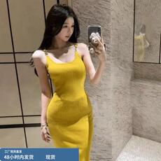 假日多巴胺黄色金属拼接针织吊带连衣裙女中长款收腰显身材包臀裙
